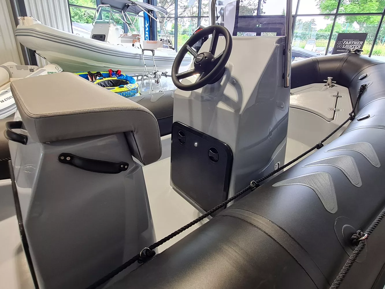 Gel coat gris, flotteur pvc noir, console Optima FTC avec réservoir carburant 68L, siège Bolster avec coffre.