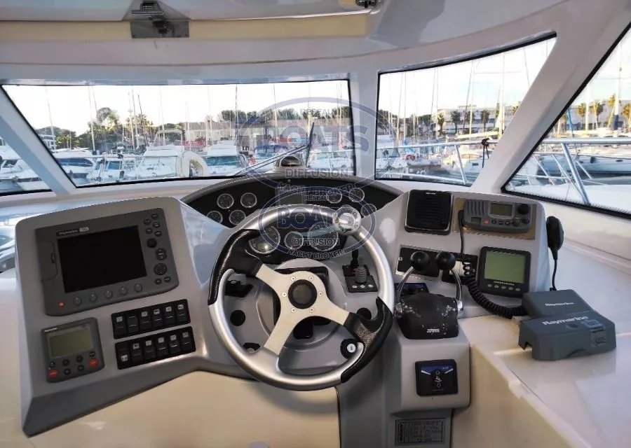 Equipé d'un propulseur d'étrave, les manœuvres sont plus faciles. Radar, gps, sondeur, vhf, flap, vous permettent de naviguer en toute sécurité. Son toit panoramique vous offre une vision exceptionnelle, et une protection efficace des embruns ou du soleil.
