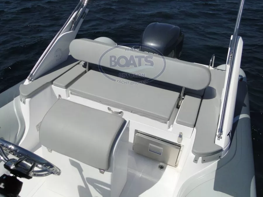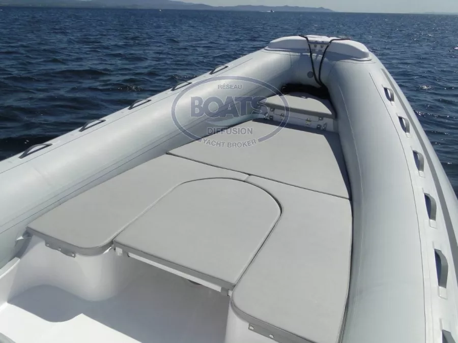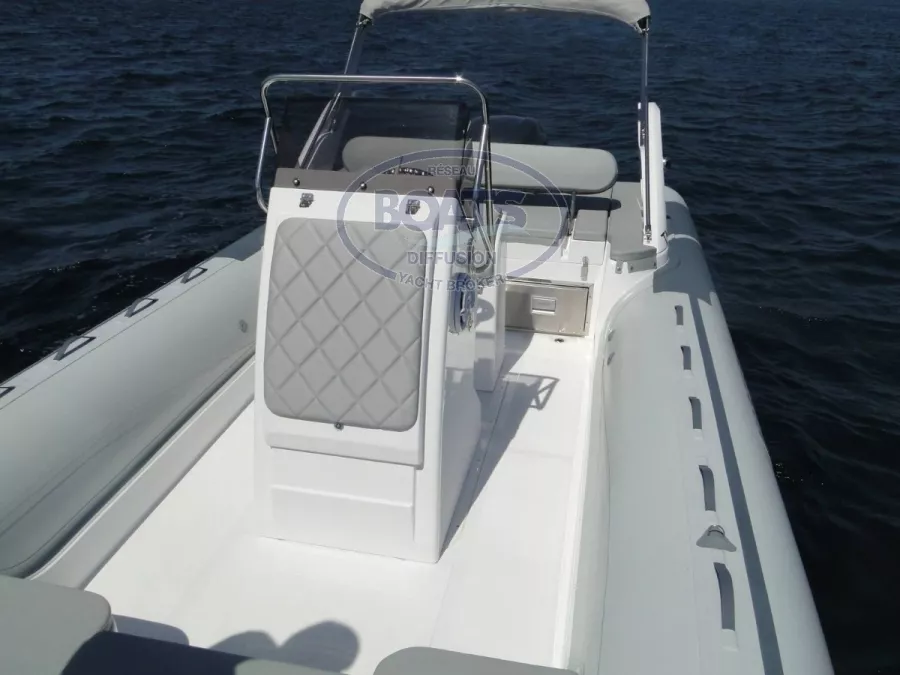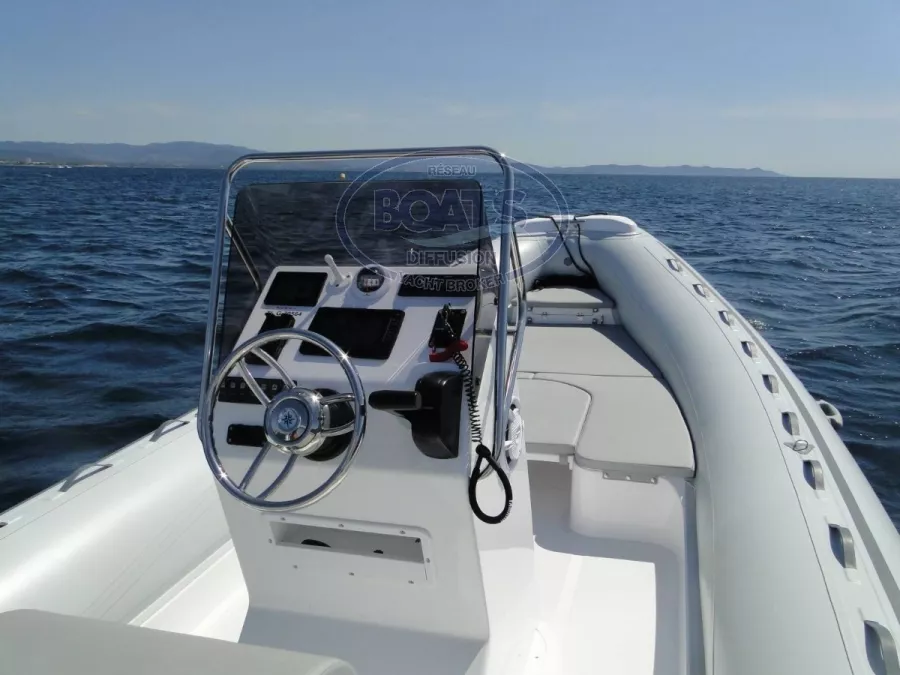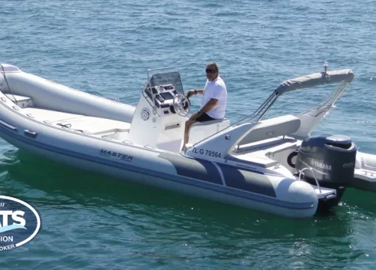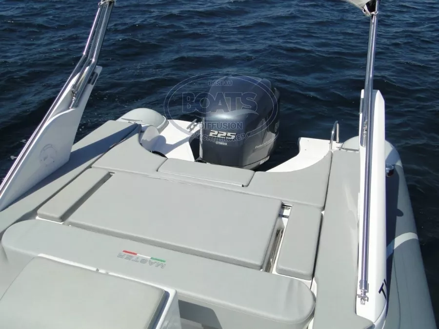 Beau semi-rigide séduisant que ce Master 730 Open modèle 2023. Il est doté d'une carène de référence dans la gamme. Excellent en ligne droite, quel que soit l'angle d'attaque des vagues, et particulièrement confortable en vitesse de croisière (25-30 nœuds de 3 500 à 4 000 tr/min), le Master 730 est tout aussi à l'aise en virages, ou l'on apprécie sa direction précise. Propulse par un YAMAHA F225 il permet d'atteindre rapidement une vitesse de 45-47 nœuds.
