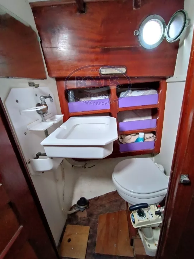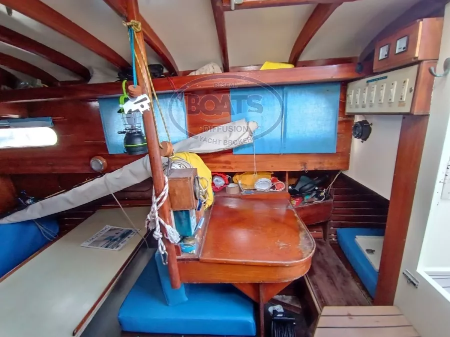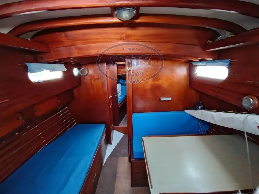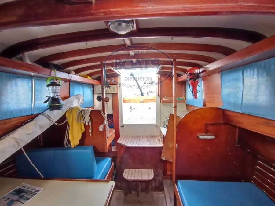 Aménagement intérieure: 6 couchettes, marqueterie tout acajou, cuisine dans l'esprit d'origine, Sellerie de 2020, Cabine toilette refaite en 2020.
