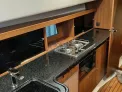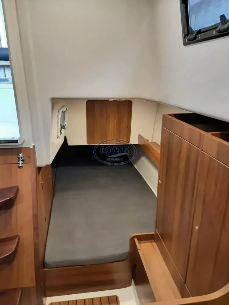 L’intérieur lumineux, avec boiseries style teck naturel, offre une belle hauteur sous barrot de 1,97 m, un carré convivial transformable en couchage double, pour un total de 6 couchages. La cuisine est entièrement équipée avec réfrigérateur CR 65 (64 L) et micro-ondes encastré.