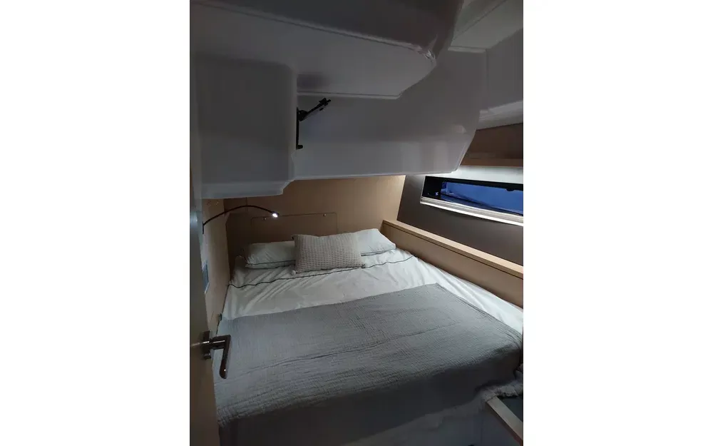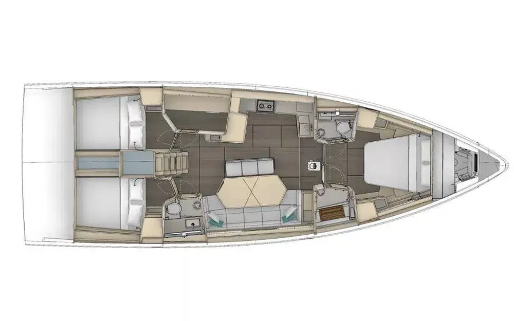 Version 3 cabines, 2 salles d'eau, 1douche, 1 rangement à bâbord, cuisine frontale