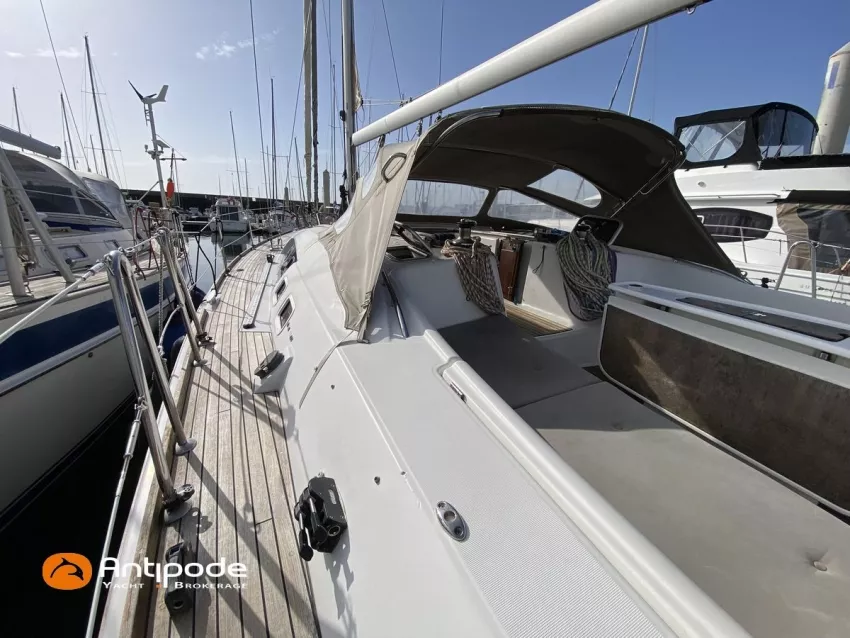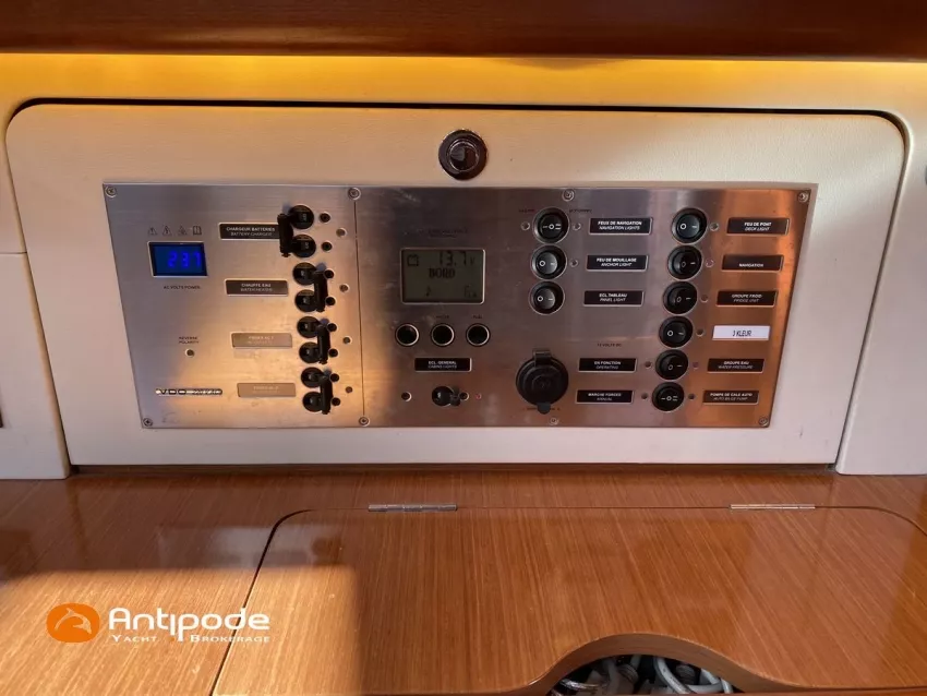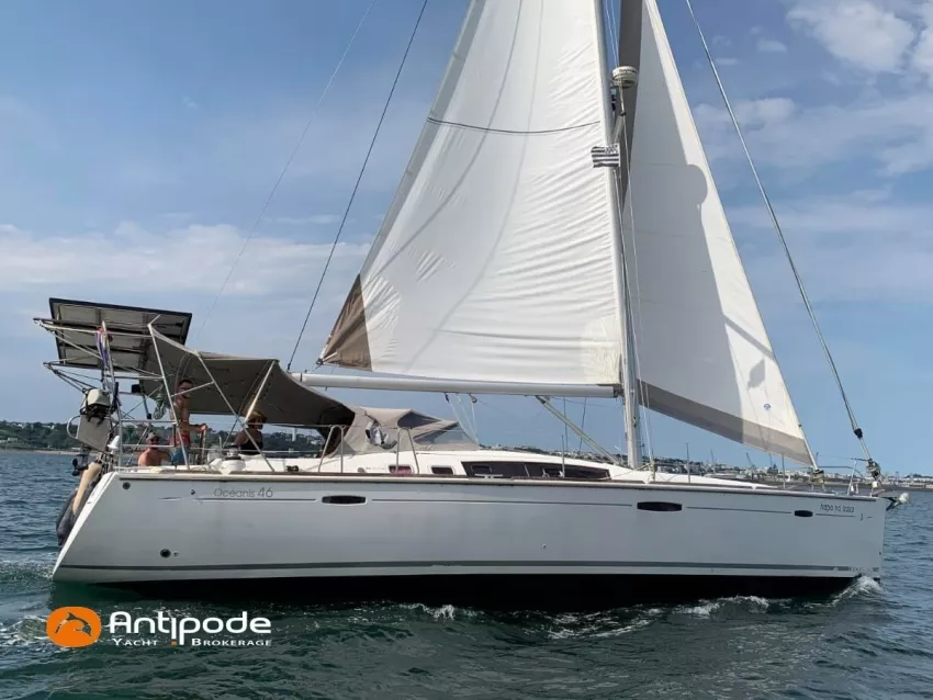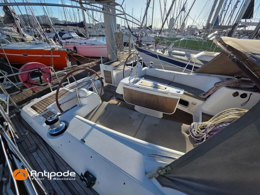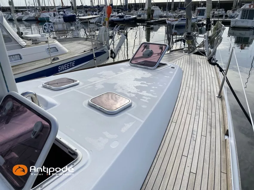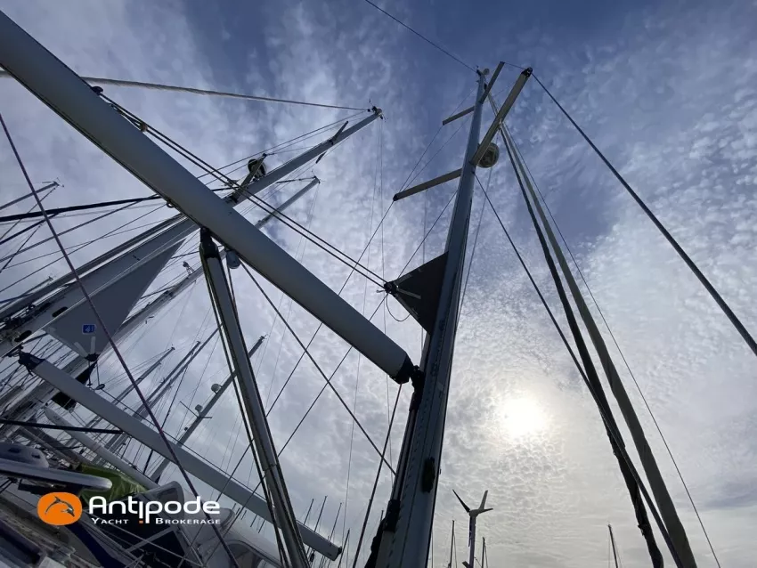 OCEANIS 46, 2009, YANMAR, 75 cv Propulseur d'étrave, Version GTE, Version d'aménagement intérieur 1 cabine avant, 2 cabines arrières, 2 cabinets de toilettes et douche, Selleries carré simili cuir, Winch électrique de manoeuvre sur roof, Rail d'écoute de grand-voile sur le roof, Passavants teck, Fond de cockpit latté teck, Table de cockpit avec abattants bois, Double barre à roue, Capote de roof, Bimini top cockpit, Coussins de cockpit, Compteur de chaine au cockpit, Portique arrière, Mât enrouleur posé sur le pont - service 2023, Génois sur enrouleur, Trinquette sur enrouleur - 2018, Spinnaker asymétrique, Pilote automatique in board Raymarine, GPS / lecteur de carte dans le cockpit - E80, Radar avec radôme sur support de mât, Transpondeur AIS (émetteur récepteur), Balise de détresse, Unité réfrigérante 12 V ouverture par le dessus, Unité réfrigérante 12 V porte frontale, Four à micro-ondes, Contrôleur / gestionnaire de batteries, Chauffage WEBASTO, Dessalinisateur a reviser, WC électrique, Panneaux solaires - 3x 245W, Eclairages intérieurs à Leds, Radeau de survie - 2026, Annexe , Moteur hors-bord, Visible Bretagne. Pour plus d'informations ou pour fixer un rendez-vous de visite, contact : François Mouchel 06 62 30 97 30 - francois@antipode-yachts.com