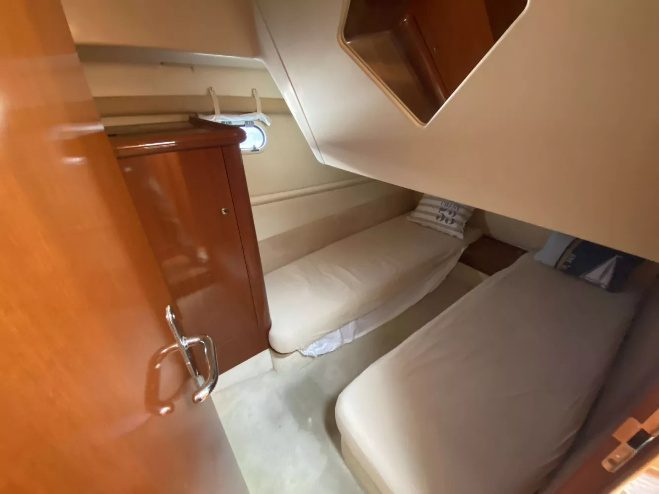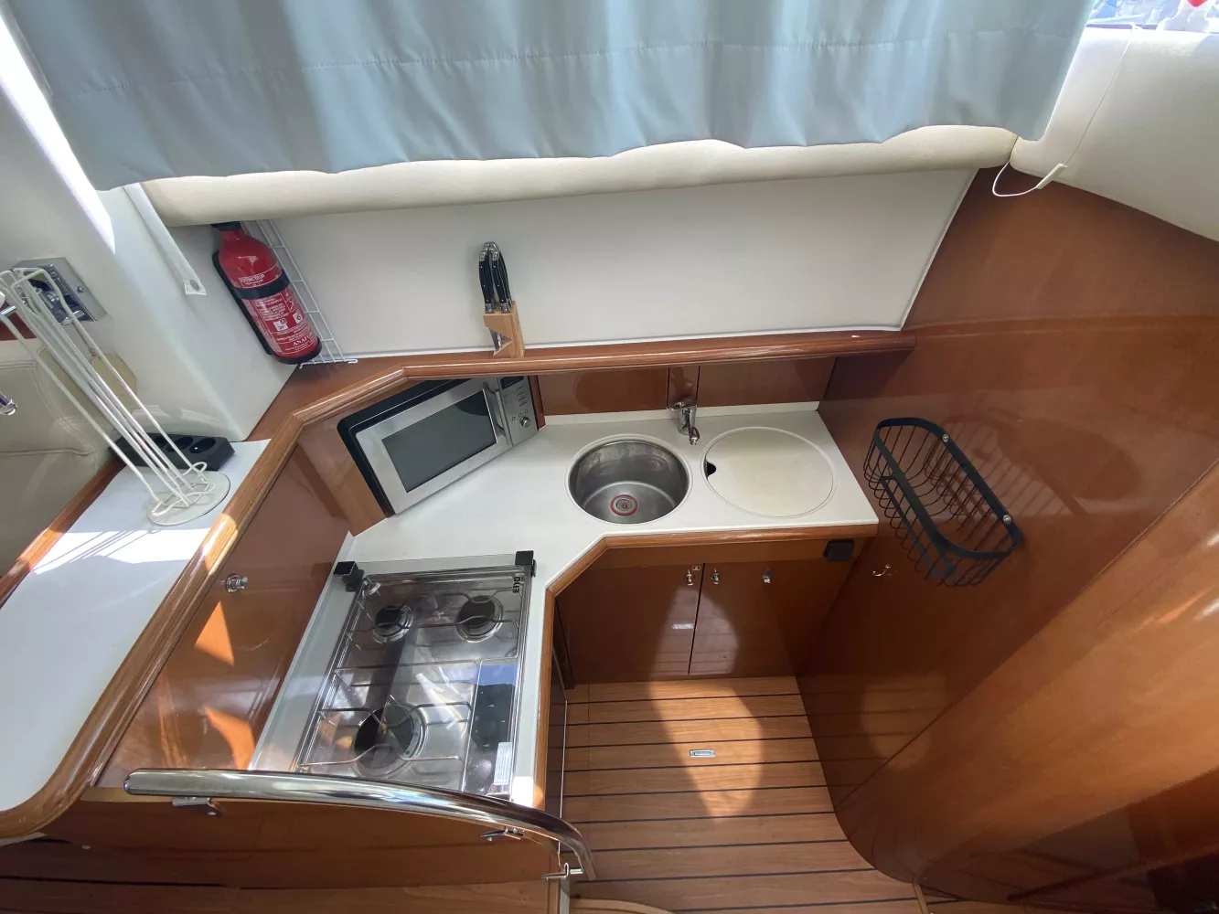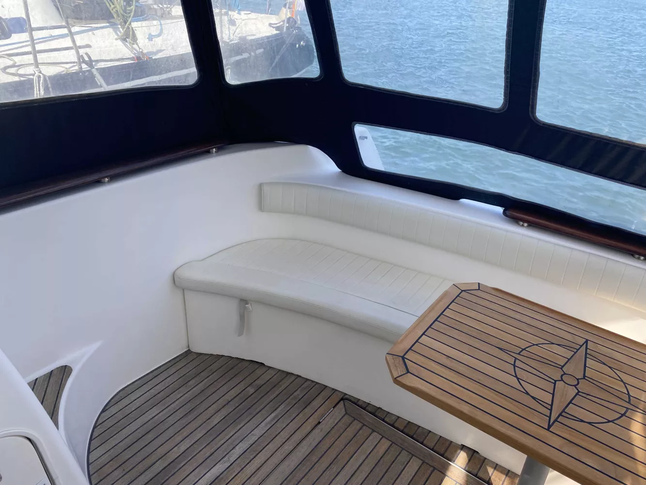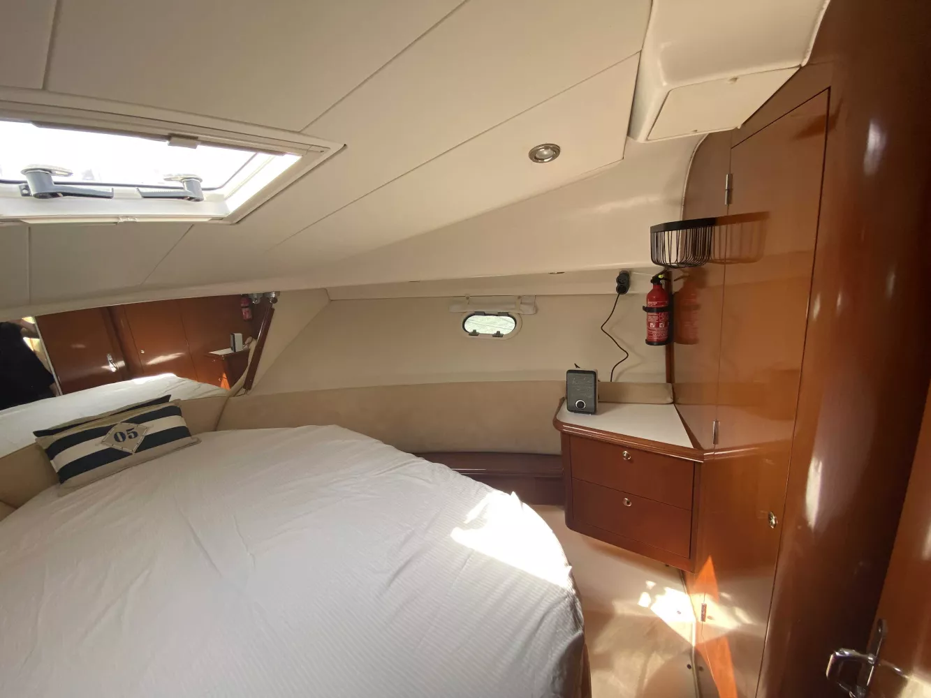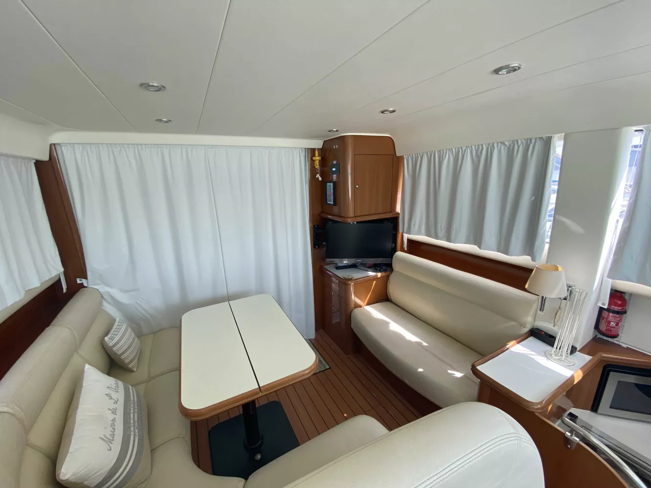 *Intérieur : Les boiseries intérieures, planchers et selleries sont en très bon état, 1 cabine propriétaire, 1 cabine invités, 1 salle d'eau avec douche + WC marin, Coin Cuisine (avec double éviers eau chaude/froide sous pression, Réchaud gaz 3 feux, Réfrigérateur et 1 four micro-onde), Chauffe eau (40L), Chauffage WABASTO, Télévision SONY, Grand coin salon avec grande table dépliable pour les repas, Rideaux en très bon état, Auto-radio pioneer, Nombreux rangements.